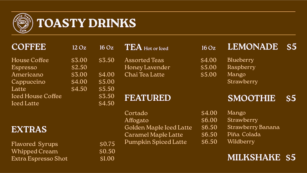 Welcome to Toasty Treats Cafe, a hidden gem located at 6335 Haggerty Rd in West Bloomfield Township, MI. This inviting cafe offers a delightful menu that captures the essence of comfort food and artisanal brews.